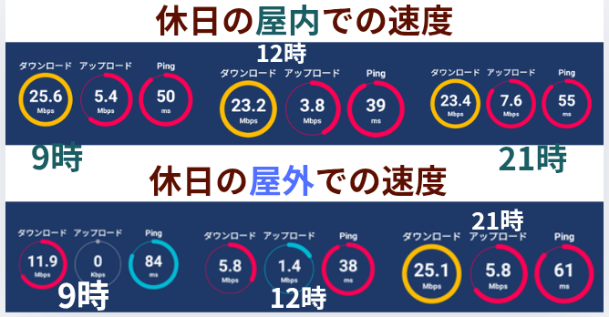 屋内で高速だったのに対し、屋外の昼間は回線混雑で大きく速度が低下するためです。